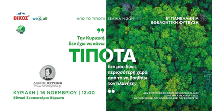 Ο Δήμος Βύρωνα, σε συνεργασία με τη ΒΙΚΟΣ, τον περιβαλλοντικό οργανισμό we4all και το European ClimatePact, σας προσκαλεί να συμμετάσχετε στη 6η Πανελλήνια Εθελοντική Φύτευση, μια μεγάλη περιβαλλοντική δράση που ενώνει όλη την Ελλάδα!