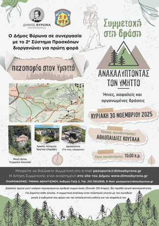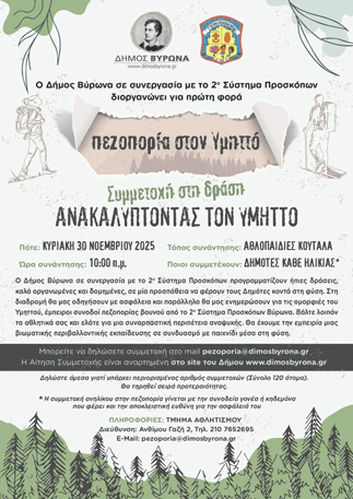 Ο Δήμος Βύρωνα, σε συνεργασία με το 2ο Σύστημα Προσκόπων Βύρωνα, διοργανώνει για πρώτη φορά μια μοναδική πεζοπορική δράση στον Υμηττό με τίτλο «Ανακαλύπτοντας τον Υμηττό», προσκαλώντας δημότες όλων των ηλικιών να γνωρίσουν τη φύση, την ιστορία και τα μονοπάτια του βουνού.
