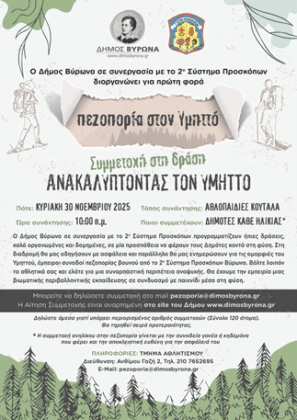 Ο Δήμος Βύρωνα καλεί όλους τους δημότες να ζήσουν μια ξεχωριστή εμπειρία περιήγησης και περιβαλλοντικής εκπαίδευσης, συνδυάζοντας γνώση, άσκηση και ψυχαγωγία μέσα στη φύση.