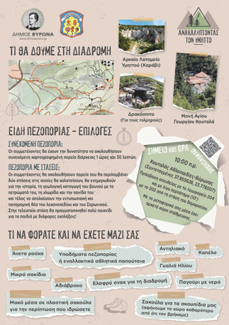 Οι συμμετέχοντες θα έχουν την ευκαιρία να επισκεφθούν τη Μονή Αγίου Γεωργίου Κουταλά, το Αρχαίο Λατομείο Υμηττού (Καράβι) και το Δρακόσπιτο (για τους πιο τολμηρούς) και θα πρέπει να έχουν μαζί τους άνετα ρούχα & υποδήματα πεζοπορίας ή αθλητικά παπούτσια, μικρό σακίδιο, καπέλο, αντηλιακό, γυαλιά ηλίου, αδιάβροχο, καθαρό μακό μπλουζάκι, παγούρι με νερό & ελαφρύ σνακ, σακούλα για τα απορρίμματα – κρατάμε το βουνό καθαρό!