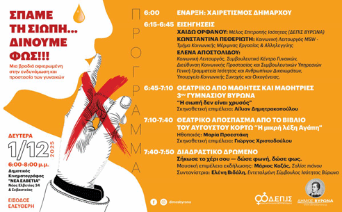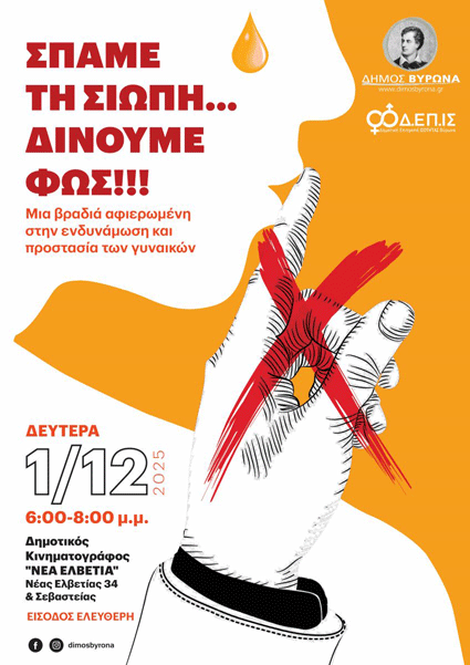 Με αφορμή την Παγκόσμια Ημέρα για την Εξάλειψη της Βίας κατά των Γυναικών, o Δήμος Βύρωνα και η Επιτροπή Ισότητας Δήμου Βύρωνα (ΔΕΠΙΣ) σας προσκαλούν τη Δευτέρα 1 Δεκεμβρίου 2025, ώρα 18:00, στον Δημοτικό Κινηματογράφο “Νέα Ελβετία”, σε μια ανοιχτή εκδήλωση αφιερωμένη στην ενδυνάμωση των γυναικών και την προώθηση των ανθρωπίνων δικαιωμάτων.