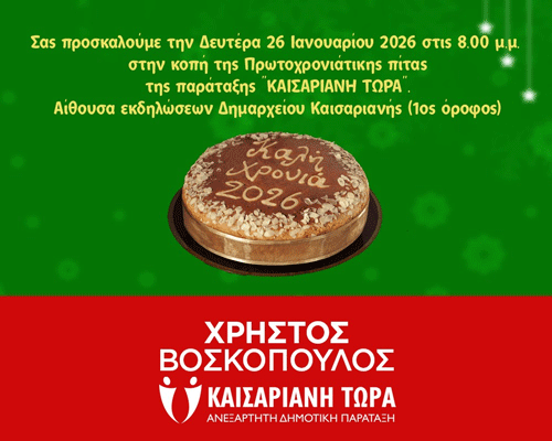Με ιδιαίτερη χαρά σας προσκαλούμε στην εκδήλωση για την κοπή της πρωτοχρονιάτικης πίτας της παράταξής μας, «Καισαριανή Τώρα»