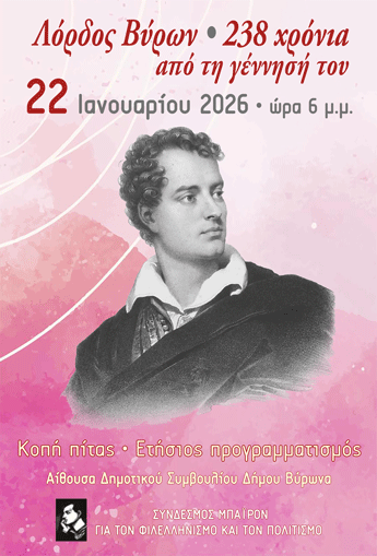 Όπως κάθε χρόνο, ο Σύνδεσμος Μπάιρον για τον Φιλελληνισμό και τον Πολιτισμό, τιμά τα γενέθλια του Λόρδου Βύρωνα, φέτος συμπληρώνονται 238 χρόνια από την γέννησή του.