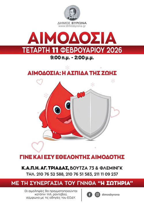 Ο Δήμος Βύρωνα, σε μια κοινή προσπάθεια αλληλεγγύης με το Γ.Ν.Ν.Θ.Α. «Η ΣΩΤΗΡΙΑ», σας προσκαλεί στην πρώτη Εθελοντική Αιμοδοσία της νέας χρονιάς.
