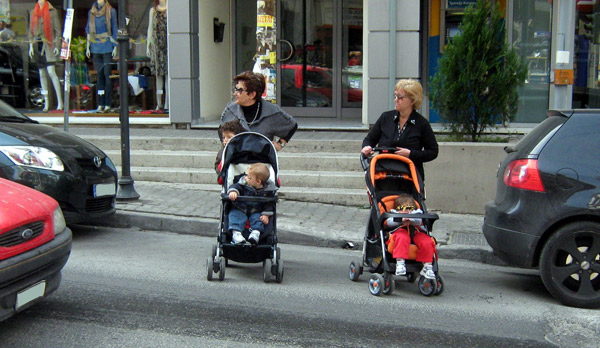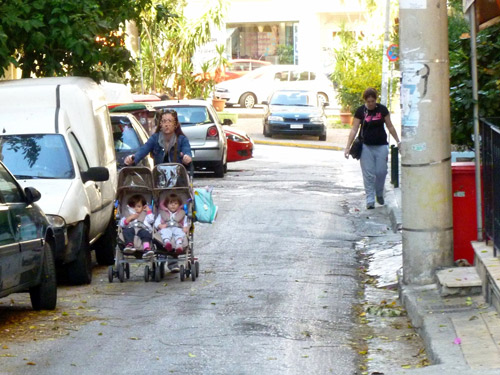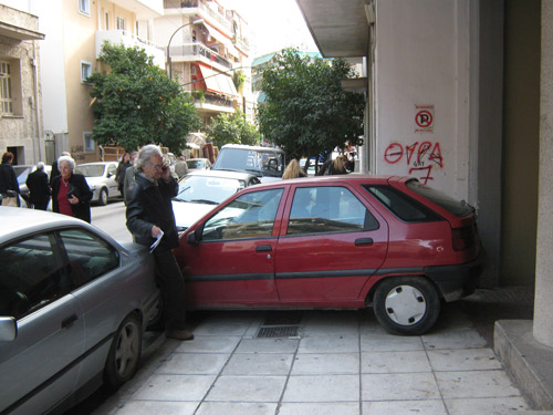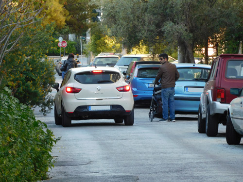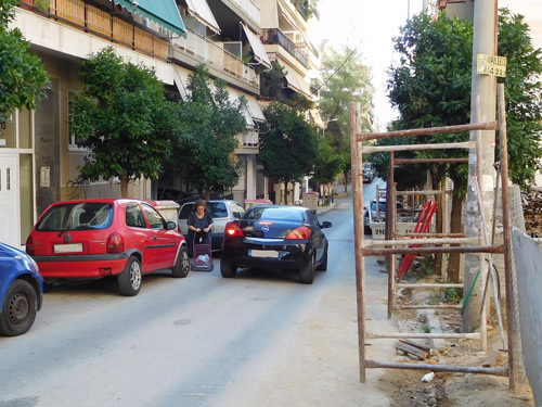 Στο ίδιο μάθημα τους είπαν ότι πρέπει να περπατούν πάντα στο πεζοδρόμιο. Τα παιδιά κάνουν φιλότιμες προσπάθειες. Βλέπω ένα κουτσοδόντικο αγοράκι, 7 χρονών το πολύ, να προσπαθεί να περάσει από το πεζοδρόμιο μπροστά στο 10ο δημοτικό: περνά πρώτα το χέρι με το τσαντάκι του κολατσιού και μετά γυρνά στο πλάι για να χωρέσει. Η μαμά του πηγαίνει δίπλα του, αλλά από τον δρόμο, γιατί που να χωρέσει ενήλικας ανάμεσα στον τοίχο, τον κάδο και τη νεραντζιά;